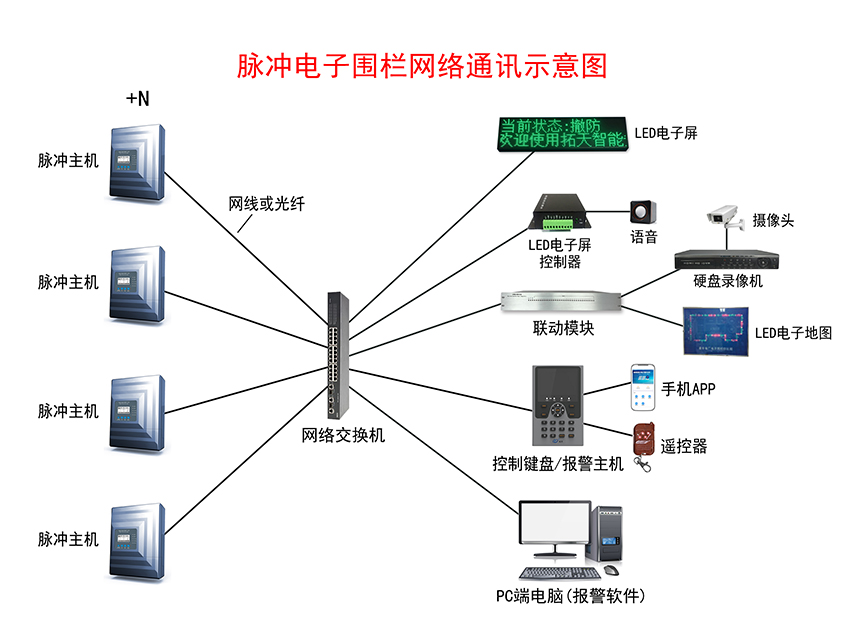 脈沖電子圍欄報警系統(tǒng)示意圖——網絡通訊+LED電子屏+語音
