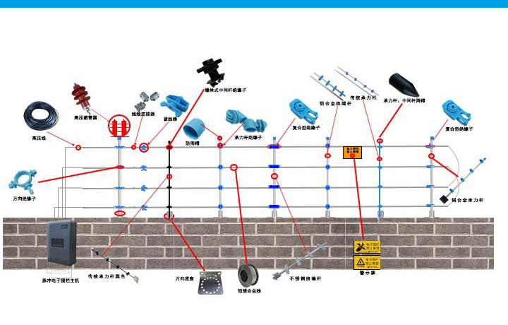 這是一個圍欄的系統圖,電子圍欄的使用壽命與維修率大部分是有圍欄前端決定的,那么什么樣的圍欄配件是我們自己所需要的,是價格便宜容易腐蝕損壞的立柱還是耐久度更好的立柱。